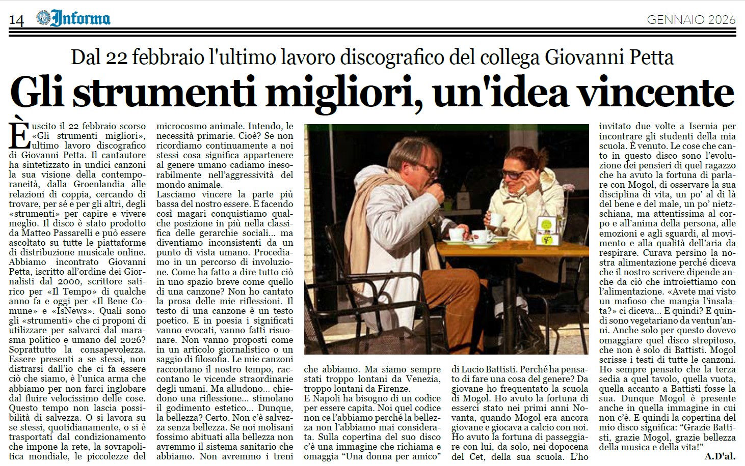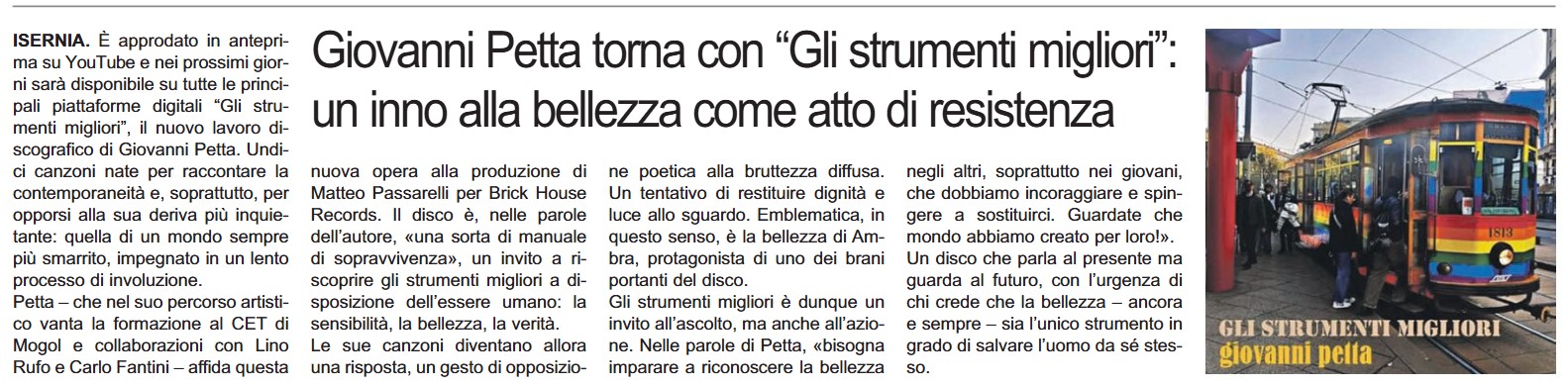Gli strumenti migliori «Gli strumenti migliori» è l'album con Giovanni Petta osserva, sconsolato, la contemporaneità e prova a proporre gli utensili più adatti, i mezzi per salvarsi dalla involuzione in atto: consapevolezza, bellezza... Undici canzoni scritte nel 2025 e proposte ora con la produzione di Matteo Passarelli. Eleonora Petta scrive la musica e suona il pianoforte di «Qualcosa che arriva». Paul Altieri regala un assolo straordinario in «Ora mi spengo». Antonnio Enrico Petta cura la grafica di copertina.